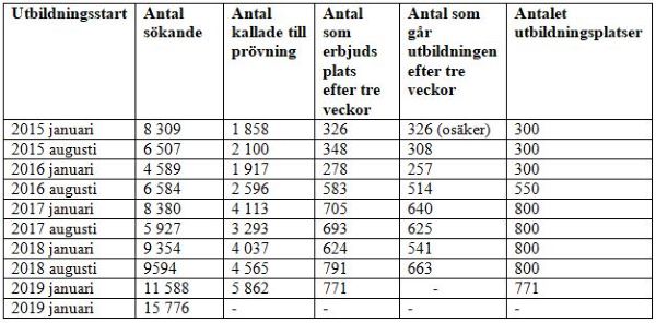 "I det ljuset blir siffrorna för januari än mindre imponerande, för nu har dessutom antalet utbildningsplatser ökat ännu mer. Det finns 1 020 platser, men bara 771 personer har klarat alla tester och antagits. Om erfarenheten upprepas kommer minst 61 av dessa att avstå från att påbörja utbildningen. Tre veckor in på utbildningen i januari 2019 kommer då 30 procent av platserna att stå tomma.