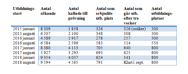 På några år har antalet utbildningsplatser ökat från 300 platser per termin år 2015 till 800 per termin i år. För utbildningsstarten i januari 2019 finns det 1 020 platser.