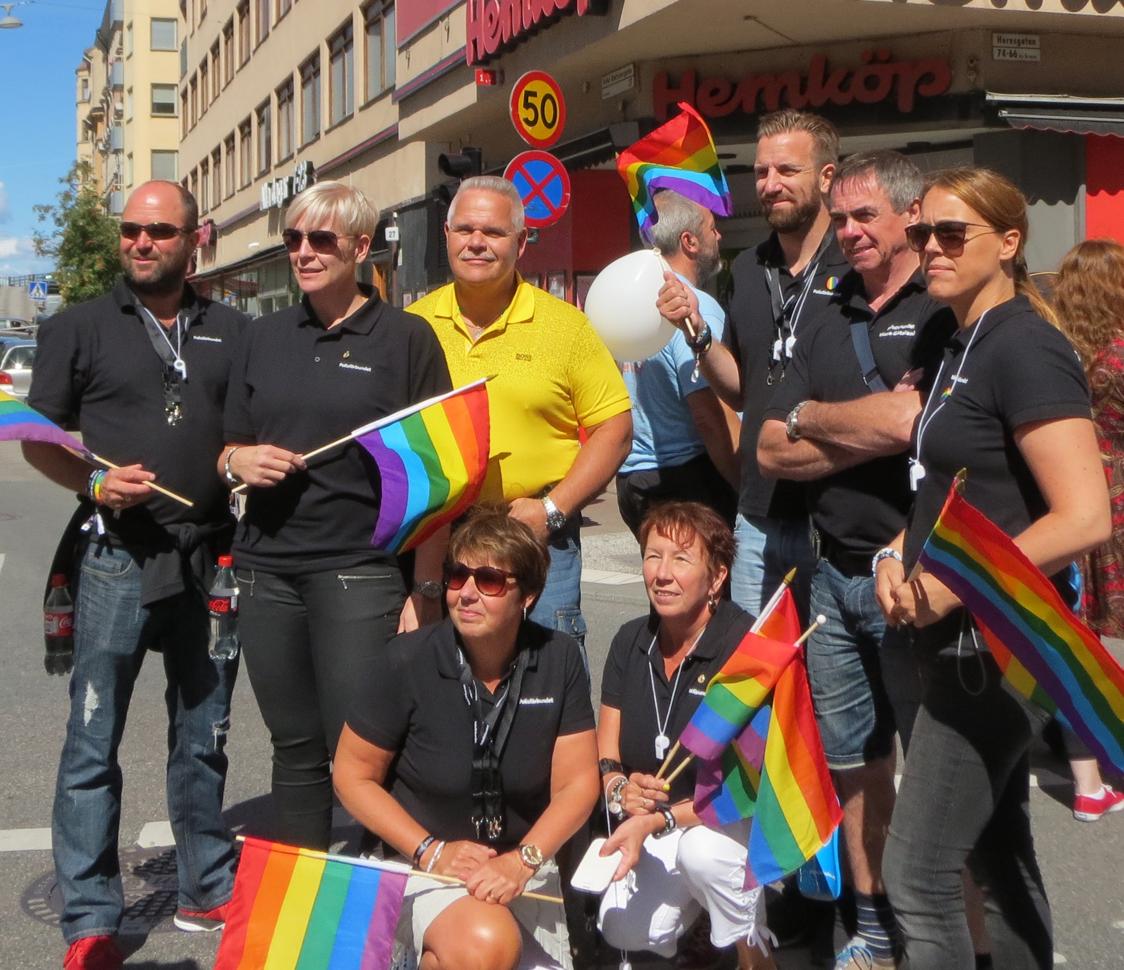 Varje år bjuder Polisförbundet in fyra förtroendevalda att delta för att sprida kunskap om HBTQ-frågor till olika delar av landet. I paraden går vi tillsammans med Polismyndigheten för att visa att vi står upp för allas lika värde. Människovärdet och lika rättigheter är en av grundbultarna som den fackliga verksamheten bygger på: