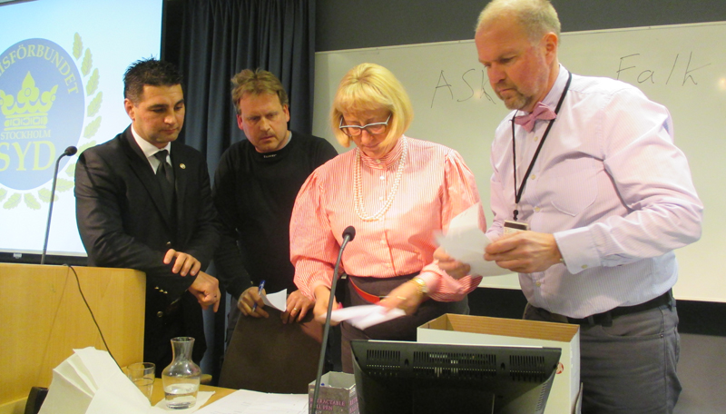 När Carolina talat färdigt, vidtog valpunkterna på dagordningen. Valberedningen hade föreslagit Kenneth Falk till ordförande, men ytterligare nominering gjordes att Ulf Ask skulle bli ordförande, vilket ledde till sluten omröstning. En aningen tidsödade procedur med alla fullmakter. De bägge ordförandena för mötet, Peter Frisell och Diana Sundin hade att göra tillsammans med justeringsmännen Ufuk Sen och Mikael Sundberg.