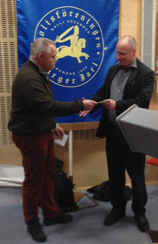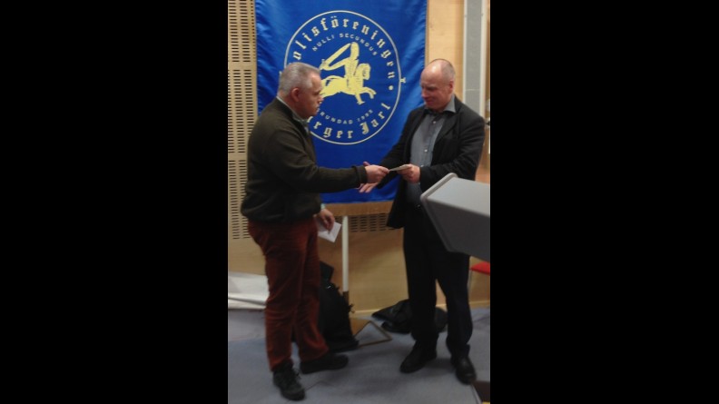 Normalt delas detta förtjänsttecken ut vid stämman för Förbundsområdet, men med anledning av att Olof den 20 mars befinner sig på sydliga breddgrader för att fira sin 60 års dag delades det ut vid Birger Jarls årsmöte.