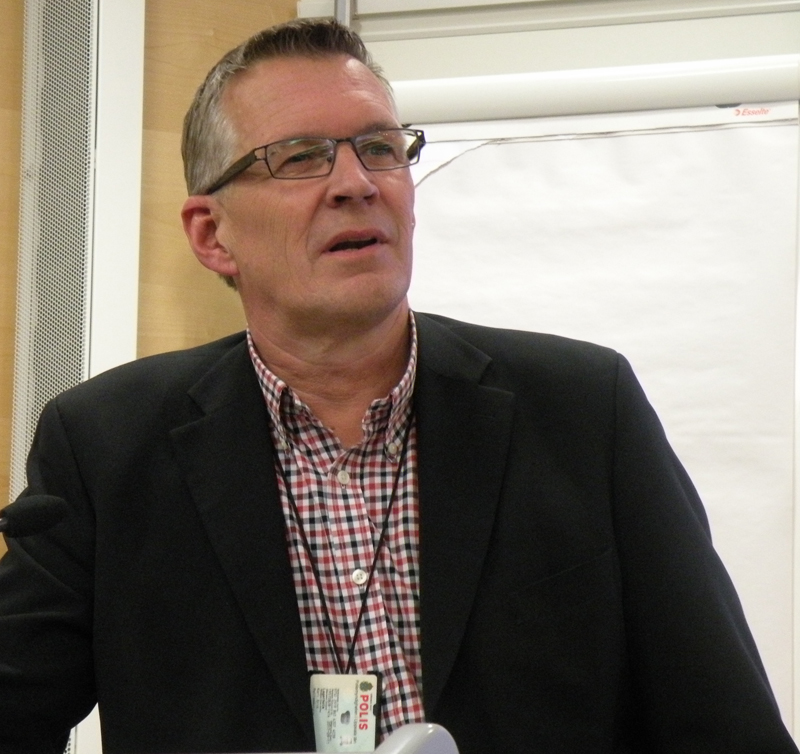 När Länspolismästaren talat färdigt och besvarat alla frågor, tog den nye ombudsmannen för chefsfrågor vid Polisförbundet, Erik Lagerholm, chansen att informera om sin nya roll. Han berättade om sin bakgrund från polis på VD 1 till polischef vid Uppsala polismyndighet. Erik kommer att ha funktionen till den 1 maj 2015. En viktig fråga är att modernisera det högsta ledarskapet. Just nu håller han på att resa runt och förankra och hämta in synpunkter från alla förbundsområden. Exempelvis – hur fungerar MBL och samverkansavtal – det är väldigt olika.