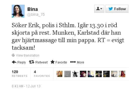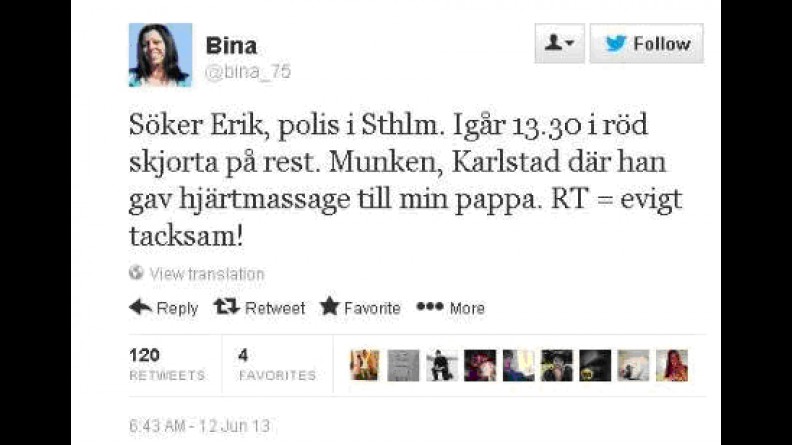 En kvinna i Karlstad vid namn Bina söker efter en polis från Stockholm som hjälpte till att ge hjärtmassage till hennes far den 10 juni. Se tweet nedan. Om Erik känner igen sig kan Bina kontaktas på Twitter.