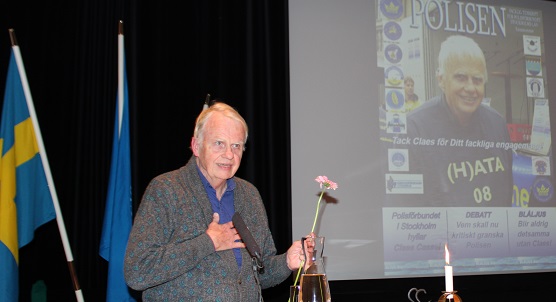 Han har ju bestämt sig för att inte längre vara redaktör och huvudansvarig för Blåljus och avtackades därför särskilt. När detta skedde, ställde sig alla närvarande spontant upp och hedrade Claes med en applåd. Claes blev märkbart berörd och synbarligen hedrad av den värme och uppskattning som gavs honom från alla närvarande fackliga förtroendemän.
