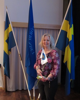 När de reguljära stämmopunkterna var avklarade, var det dags att dela ut hederstecken för de som gjort framstående fackliga insatser. Ett flertal duktiga fackliga representanter fick förbundsområdets förtjänsttecken. Susanne Piehl (bilden) och Martin Åberg fick förbundsområdets bordsflagga. Peter Frisell, som nu efter mycket lång tid avslutar sitt fackliga värv, fick förbundsområdets högsta utmärkelse, bordsstandaret. Han berättade hur han själv bland klädskåpen på Södermalm värvade självaste Stefan Eklund till det fackliga arbetet med de ungefärliga orden:
